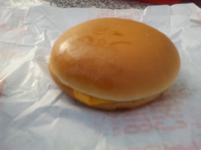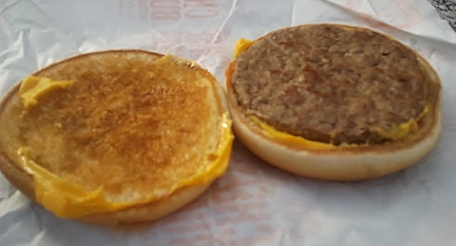 So schaut der Cheeseburger innen aus, keine Spur von Zwiebeln, Ketchup, Gurke.